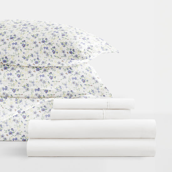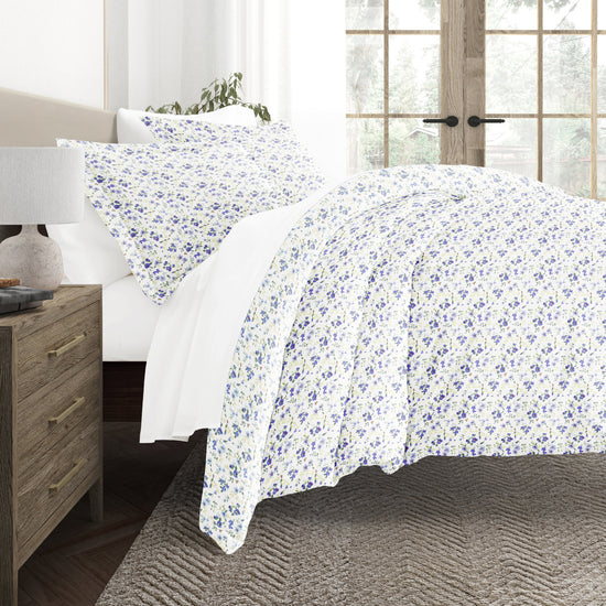 Blossoms Light Blue with White Sheets.Bedding Bundle: Pattern Duvet Cover Set, White Comforter and Solid Sheet Set