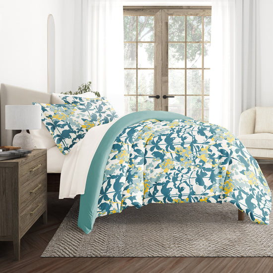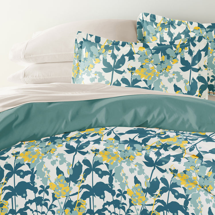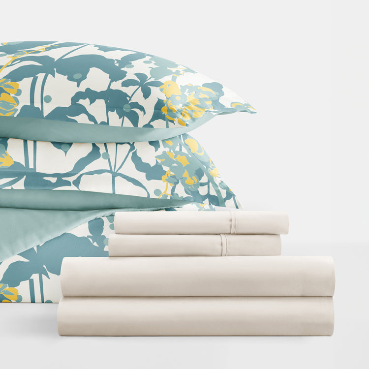 Boho Flower Teal with Ivory Sheets. Bedding Bundle: Pattern Duvet Cover Set, White Comforter and Solid Sheet Set